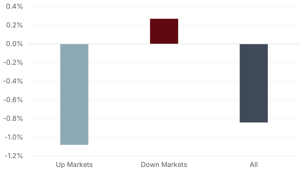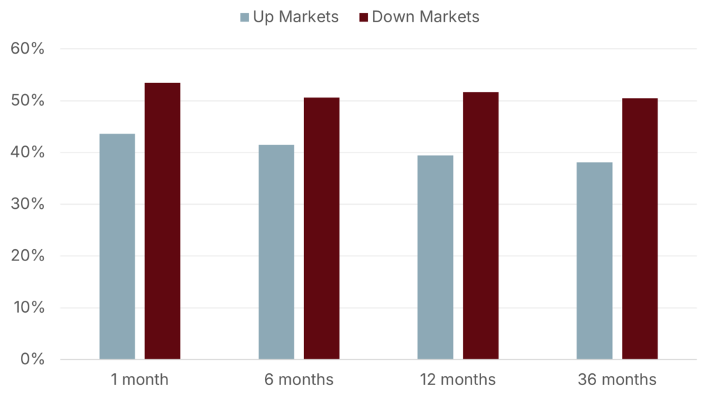 A recent article by The Evidence-Based Investor[1] offers an insightful review of 26 years’ worth of fund performance data to find out if there is any truth to the notion. Jeffrey Ptak of Morningstar[2] found that, sure enough, actively managed US equity funds have historically outperformed in down markets – but only very marginally.