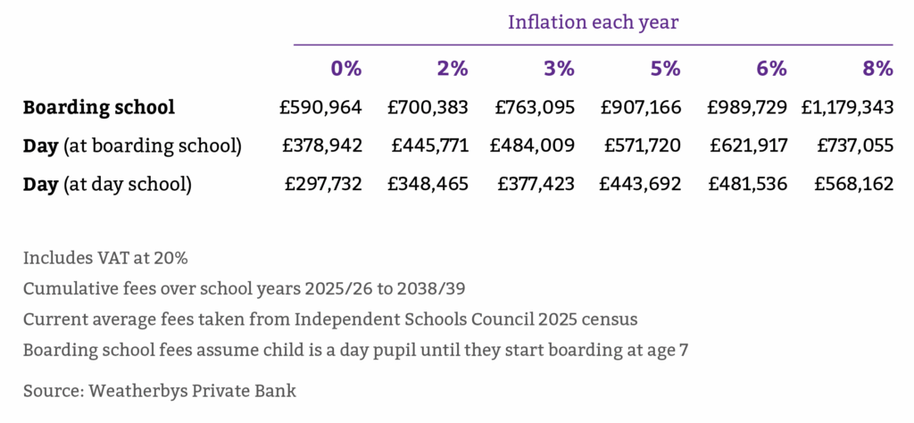 Assuming inflation at 3% (still lower than the latest CPI of 3.6%), parents enrolling reception-age children in day school in 2025 can expect to pay around £377,000 in fees to see them through private schooling to A-level. This figure rises to £763,000 for boarders. Around two thirds of the increase is due to inflation.