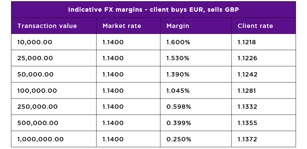 In the example, a client selling GBP 100,000 to buy EUR would get an exchange rate of 1.1281 with a transaction margin of 1.045% deducted from a market rate of 1.1400.